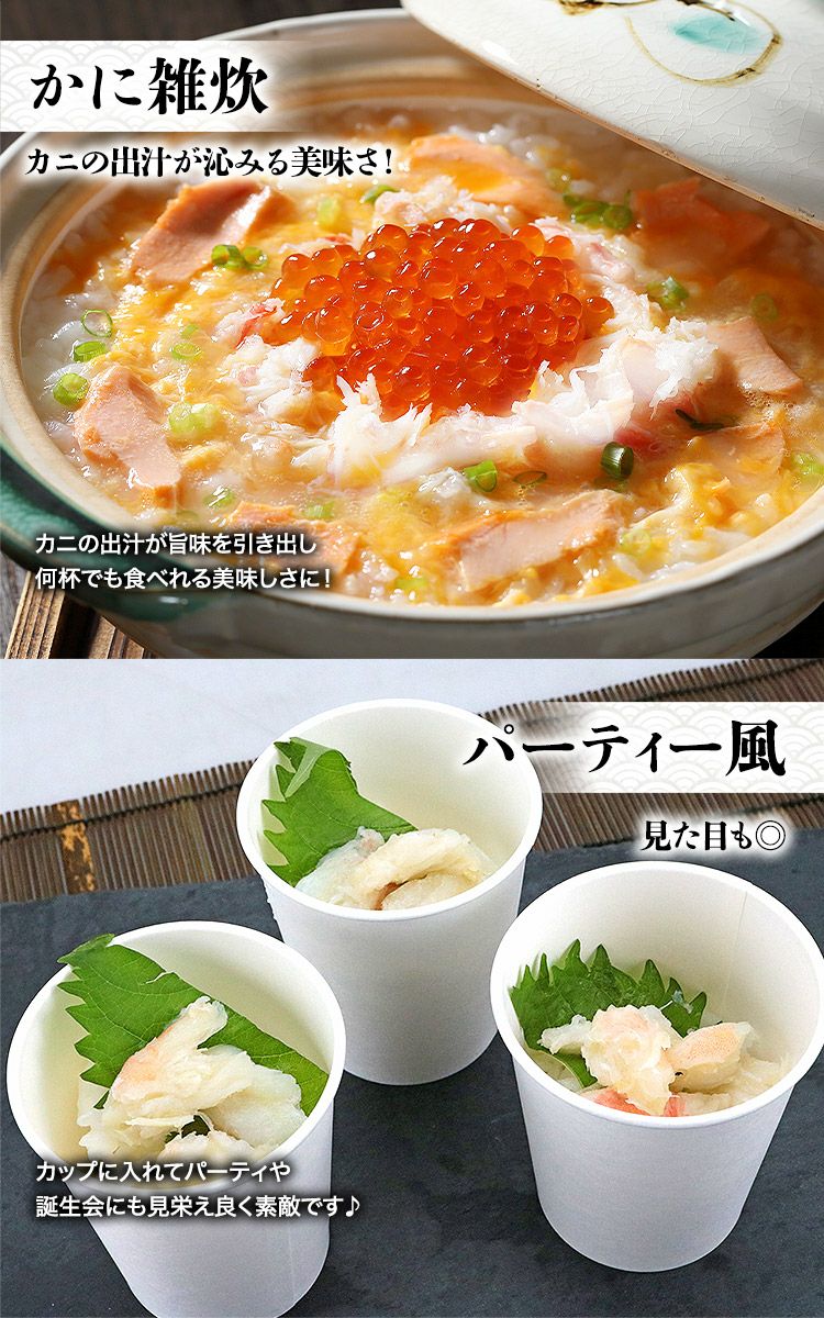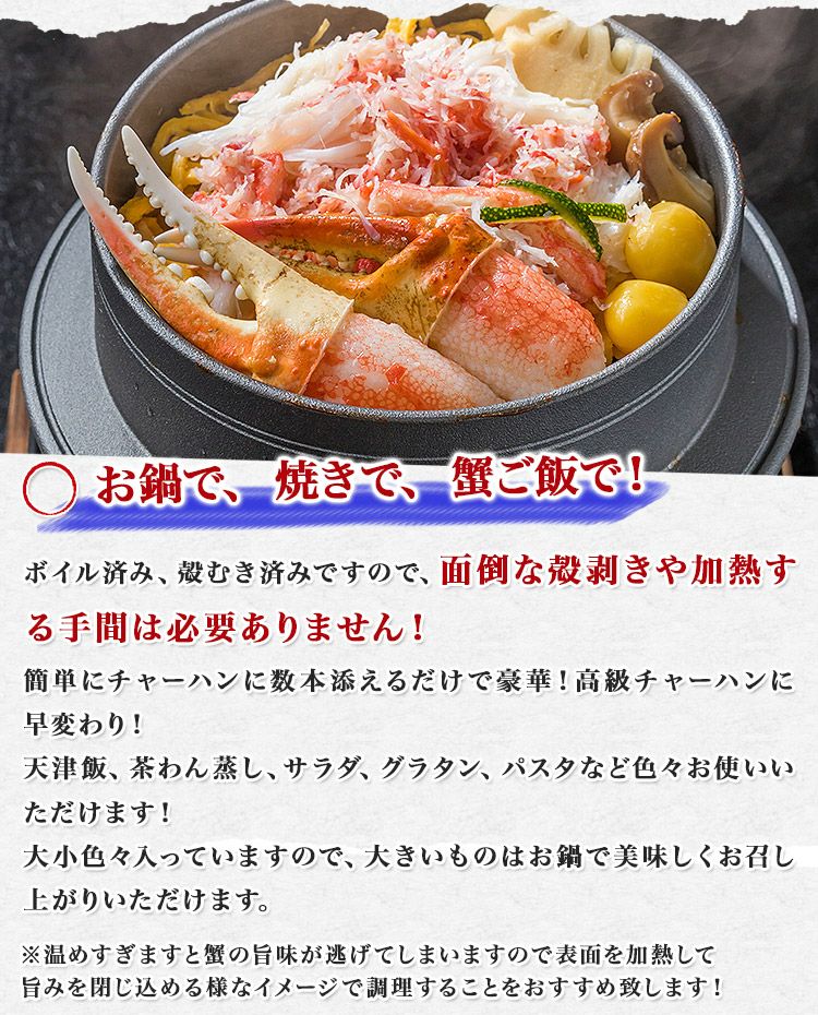 他の画像を見る ズワイガニ 部位食べ比べ 爪肉 爪下 肩肉 総重量1.5kg NET1.2kg かに カニ ずわいがに ポーション カット 当店特別価格 ¥ 6,480 税込 カートに入れる お気に入りに登録する