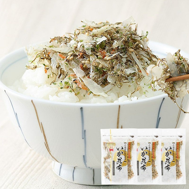 【名称】 ふりかけ食品 【原材料名】 調味昆布(昆布(北海道産)、醸造酢、還元水飴)、調味いか(いか、砂糖、食塩)、ごま、ツノナシオキアミ、砂糖、食塩、アオサ/調味料(アミノ酸等)、ソルビット、(一部にいか・ごまを含む) 【内容量】 70g×3袋 【賞味期限】 商品記載※生ふりかけとなり一般のふりかけより期限が短く、1か月以上を目安に発送しております。 【保存方法】 直射日光、高温多湿を避け、常温で保存してください。