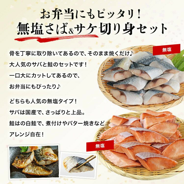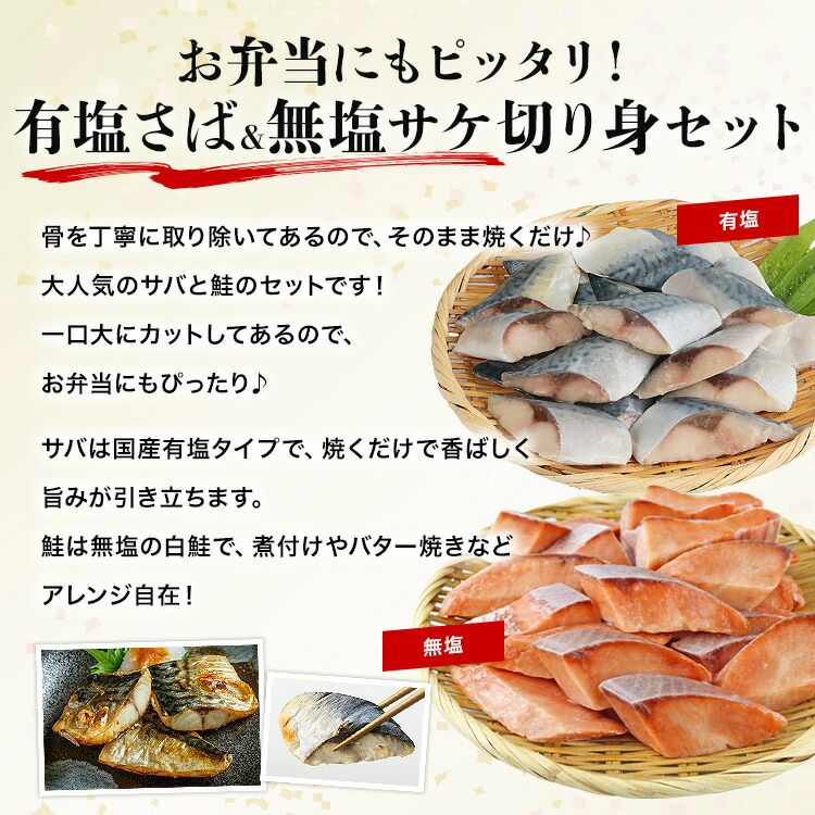 他の画像を見る 骨取り 有塩さば 無塩さけ 切り身セット 600g(30g×20切)×2 冷凍 骨なし 鯖 サバ 鮭 一口サイズ 当店特別価格 ¥ 3,480 税込 カートに入れる お気に入りに登録する