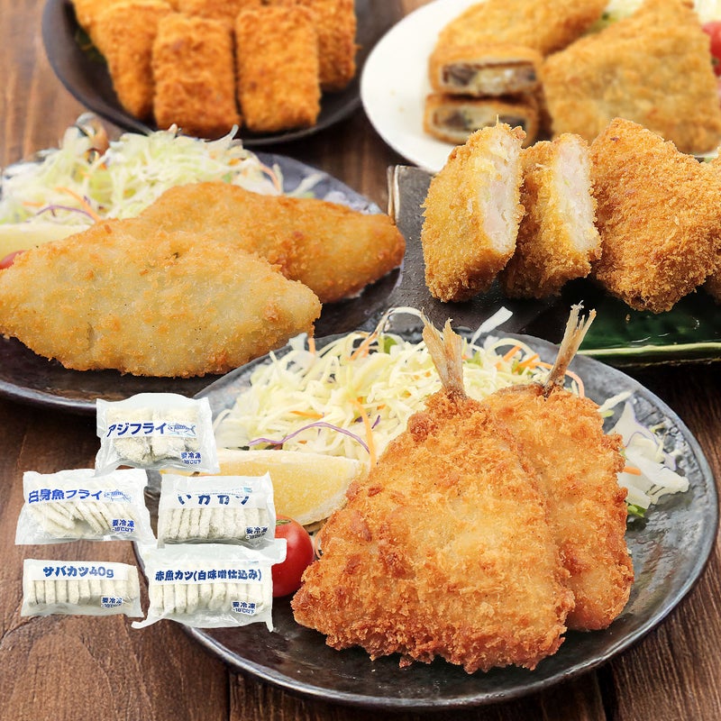 あじフライ、白身フライ、イカカツ、さばカツ、赤魚カツのいずれか3種をお届けします。